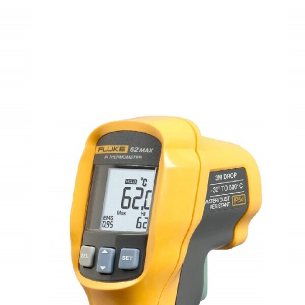 The Fluke 59 MAX Infrared Thermometer is a precision thermometer that delivers accurate, repeatable measurements and still fits within your budget. Use the bright backlit LCD display on the Fluke 59 MAX to perform non-contact temperature measurements on transformers, motors, pumps, panels, breakers, compressors, ducts, and vents.