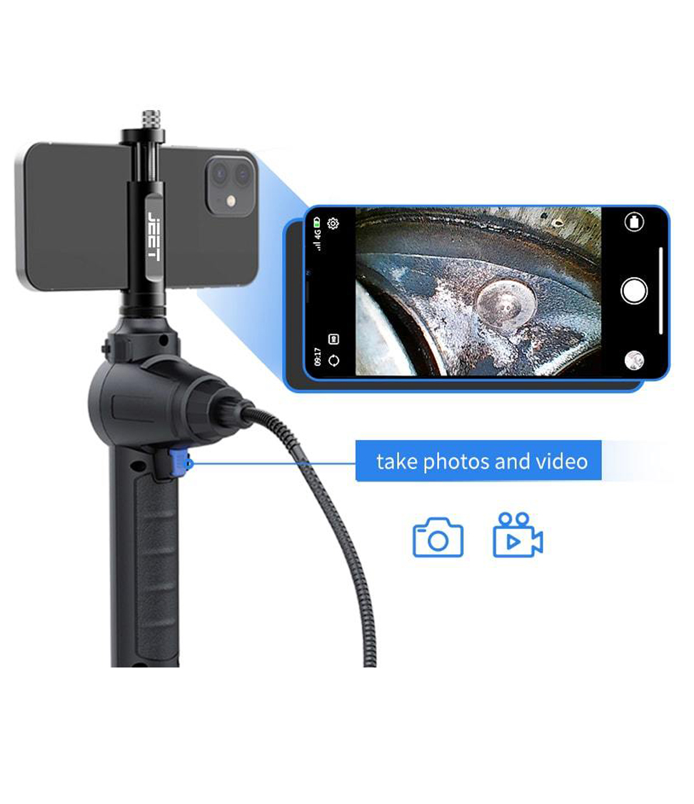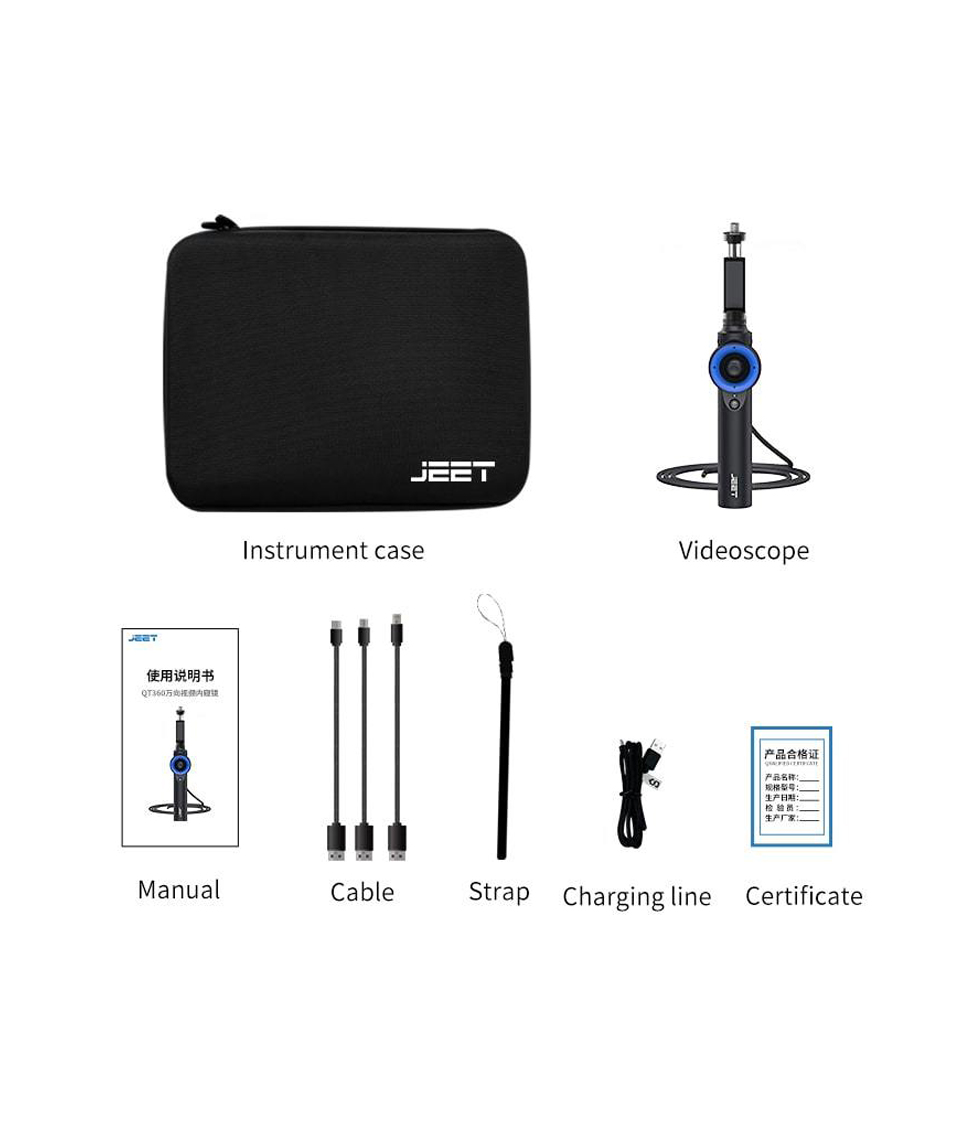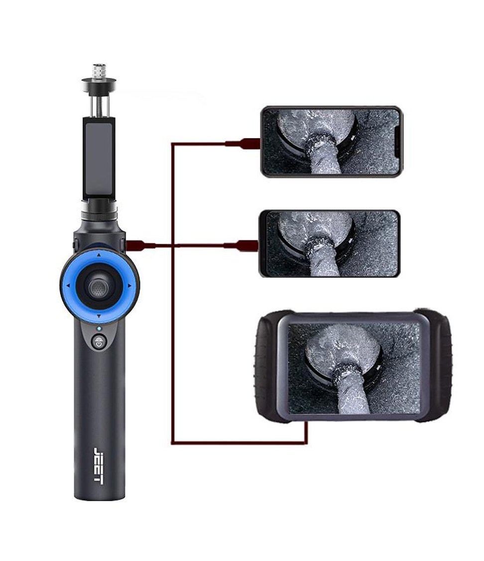 QT360 Series All-Way Articulation Videoscope is a 360 ° all-round accurate steering cell phone video borescope independently developed by Shenzhen JEET, the product can achieve 360 ° probe steering, 210 ° large angle bending, through the data line will be real-time screen transmission to the Android / Apple cell phone display, while equipped with a high temperature intelligent alarm function and generate inspection reports function. Widely used in the automotive aftermarket to detect the car evaporation box, combustion chamber, three-way catalytic, etc., as well as difficult to access the narrow space and home pipeline and other hidden spaces that are not easy to view.