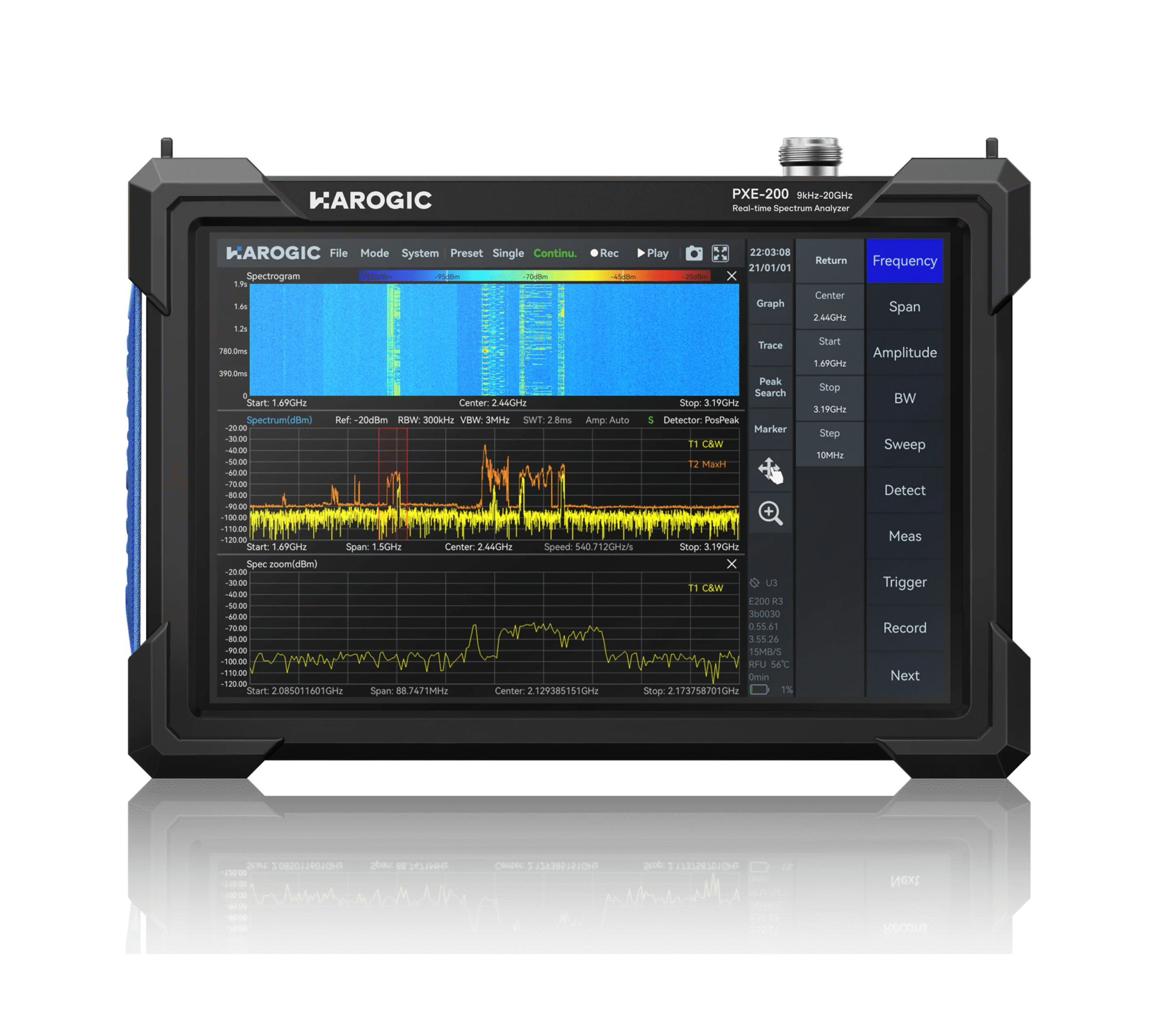 PXE series is the real-time spectrum analyzer up to 20 GHz with analytical bandwidth of 100 MHz and ultra-fast speed of 900 GHz/s, delivering standard spectrum sweep (SWP), IQ streaming (IQS), zero span (DET) and real-time analysis (RTA) working mode. The PXE-200 achieves good dynamic range and phase noise level. It can provide customers with spectrum analyzer, spectrum monitoring, interference finding, RF test and measurement functions.